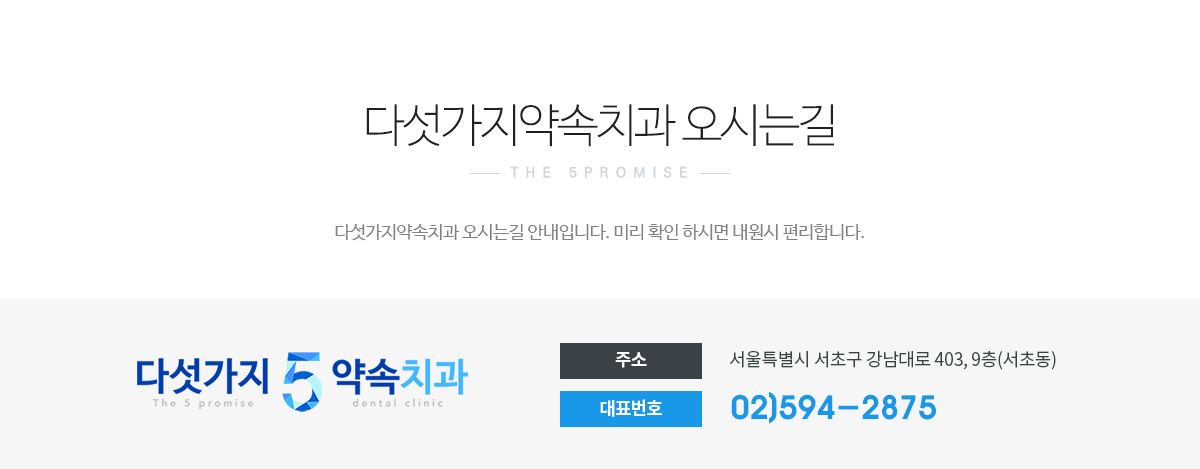 "다섯가지약속치과의원"은 수집한 개인정보를 다음의 목적을 위해 활용합니다. 이용자가 제공한 모든 정보는 하기 목적에 필요한 용도 이외로는 사용되지 않으며 이용 목적이 변경될 시에는 사전 동의를 구할 것입니다.